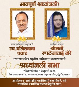 उपमुख्यमंत्री अजितदादा पवार व मावळच्या माजी आमदार रुपलेखाताई ढोरे यांच्या स्मृतीत अभिवादन करण्यासाठी रविवारी  (दि . १ फेब्रुवारी ) सायंकाळी ६ वाजता देहूरोड बाजार पेठेतील ऐतिहासीक सुभाष चौक येथे श्रद्धांजली सभेचे सर्वपक्षिय पदाधिकारी व सर्व संघटनांच्या वतीने आयोजन करण्यात आले आहे .