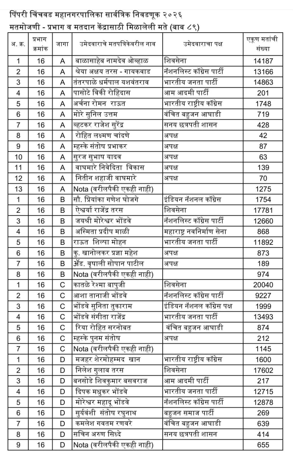 प्रभाग १६ ब मध्ये शिवसेना उमेदवार ऐश्वर्या राजेंद्र तरस यांनी १७७८१ मते घेत विजय मिळविला . प्रभाग १६ क मध्ये शिवसेना उमेदवार रेश्मा बापू कातळे यांनी सर्वाधिक २००४० मते घेत विजय मिळवला . प्रभाग १६ ड मध्ये शिवसेना उमेदवार निलेश गुलाब तरस यांनी १७६०२ मते घेत विजय मिळवला.