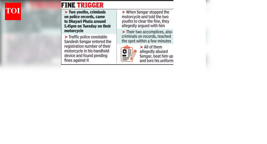 सेंगर, नेहमीच्या सरावानुसार, त्यांच्या मोटारसायकलचा नोंदणी क्रमांक हँडहेल्ड डिव्हाइसमध्ये प्रविष्ट केला. गॅझेटने दुचाकीवरील दंड प्रलंबित दाखवल्याने वाहतूक पोलिस हवालदाराने ते थांबवले. सेंगरने दोन तरुणांना मोटरसायकलचा दंड भरण्यास सांगितल्यावर त्यांनी त्याच्याशी वाद घातला.त्यांचे अन्य दोन साथीदार काही मिनिटांतच घटनास्थळी पोहोचल्याचे पोलिसांनी सांगितले. त्यानंतर या सर्वांनी सेंगरला शिवीगाळ करत मारहाण केली. त्यांनी त्याचा गणवेश फाडला आणि पळून जाण्यापूर्वी त्याला धमकावले, असे पोलिसांनी सांगितले.वाहतूक पोलिस हवालदार सेंगर यांनी नंतर नर्हे पोलिसांकडे कलम 132 (लोकसेवकाला कर्तव्य बजावण्यापासून परावृत्त करण्यासाठी प्राणघातक हल्ला किंवा गुन्हेगारी बळ), 121 (स्वेच्छेने दुखापत करणे) आणि 352 (हेतूपूर्वक अपमान) नुसार तक्रार दाखल केली. चारही तरुणांवर शरीरसुखाचे गुन्हे दाखल असल्याचे नर्हे पोलिसांनी सांगितले.पोलिसांनी दोन्ही मोटारसायकलींचा तपशील घेतला आणि घटनास्थळावरील सीसीटीव्ही फुटेजचा अभ्यास केला. संशयितांची ओळख पटवून त्यांना पोलीस ठाण्यात बोलावण्यात आले.निवृत्त सहाय्यक पोलिस आयुक्त भानुप्रताप बर्गे म्हणाले, “पोलिस कर्मचाऱ्यांनी अशा घटकांशी कठोरतेने वागले पाहिजे. अशा गुन्हेगारांना अटक करून त्यांनी हे प्रकरण तार्किक निष्कर्षापर्यंत नेले पाहिजे.”त्याच वेळी बर्गे म्हणाले की, पोलीस कर्मचाऱ्यांनी आपले कर्तव्य बजावताना आणि रस्त्यांवर व इतर सार्वजनिक ठिकाणी लोकांशी संवाद साधताना नम्रपणे वागले पाहिजे. “कधीकधी, पोलिस कर्मचारी शिवीगाळ करून संवाद सुरू करतात, जे अपेक्षित नसते आणि यामुळे सूड उगवतो,” तो म्हणाला.