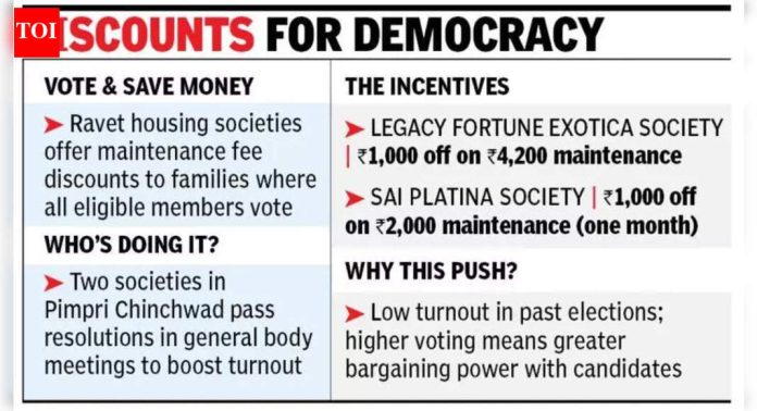 4,200 रुपये मासिक देखभाल शुल्क आकारणारी सोसायटी, ज्या सदनिकाधारकांना कुटुंबातील सदस्य मतदान करतात आणि सोसायटीच्या ग्रुपवर अमिट शाईचे चिन्ह दर्शविणारे फोटो शेअर करतात त्यांना 25% सवलत (रु. 1,000) देईल.याच परिसरात असलेल्या साई प्लॅटिना सहकारी गृहनिर्माण संस्थेनेही हा उपक्रम स्वीकारला. चेअरमन अमोल कालेकर म्हणाले की, सुमारे 100 फ्लॅट्स असलेल्या आणि 2,000 रुपये मासिक देखभाल शुल्क आकारणाऱ्या सोसायटीने कुटुंबातील सर्व पात्र सदस्यांनी मतदानाचा हक्क बजावल्याची खात्री करणाऱ्या रहिवाशांना एका महिन्यासाठी 50% सवलत (रु. 1,000) देण्याचा निर्णय घेतला आहे.“आम्ही या उपक्रमाबद्दल ऐकल्यानंतर लगेचच आम्ही आमच्या सोसायटीतही ते राबविण्याचा निर्णय घेतला. या प्रस्तावाला सर्व सदस्यांनी तत्काळ मान्यता दिली,” असे काळेकर म्हणाले, केवळ मतदानाची टक्केवारी वाढवणे हा या निर्णयाचा उद्देश आहे.ते म्हणाले, “आम्ही रहिवाशांना कोणत्याही विशिष्ट उमेदवाराला किंवा पक्षाला मत देण्यास सांगत नाही. केवळ मतदानाचा हक्क बजावण्याचे आवाहन आहे जेणेकरून जास्तीत जास्त लोक निवडणूक प्रक्रियेत सहभागी होतील,” असे ते म्हणाले.रावेत हे शहराच्या झपाट्याने विकसनशील क्षेत्रांपैकी एक आहे आणि येथे स्थलांतरित कामगारांची मोठी लोकसंख्या आहे, विशेषत: आयटी क्षेत्र, एमआयडीसी आणि कॉर्पोरेट उद्योगांमध्ये नोकरी करणारे. साळुंखे म्हणाले की, सोसायटीने चार वर्षांपूर्वी त्यांच्या गावी मतदार म्हणून नोंदणी केलेल्या रहिवाशांना त्यांची नावे पिंपरी चिंचवडमध्ये हस्तांतरित करण्यासाठी मदत करण्यासाठी मोहीम सुरू केली होती. “प्रतिसाद खूप उत्साहवर्धक होता आणि बहुतेक रहिवाशांनी त्यांची मतदार नोंदणी या भागात हलवली. सध्या, आमच्या सोसायटीत राहणारे 90% पेक्षा जास्त रहिवासी आता निवडणूक आयोगाच्या नोंदीनुसार, ते ज्या भागात राहतात त्याच भागात मतदार नोंदणीकृत आहेत,” तो म्हणाला.ग्राफिक: चित्रासह- मतदान शाईशीर्षलेख: लोकशाहीसाठी सवलतमत द्या आणि पैसे वाचवारावेत गृहनिर्माण संस्था ज्या कुटुंबांना सर्व पात्र सदस्य मतदान करतात त्यांना देखभाल शुल्कात सूट देतात.हे कोण करतंय?पिंपरी चिंचवडमधील दोन सोसायट्यांनी मतदान वाढवण्यासाठी सर्वसाधारण सभेत ठराव केले.प्रोत्साहनलेगसी फॉर्च्युन एक्झोटिका सोसायटी: रु. 4,200 देखभालीवर रु. 1,000 सूटसाई प्लॅटिना सोसायटी: रु. 2,000 देखभालीवर रु. 1,000 सूट (एक महिना)हा धक्का का?मागील निवडणुकीत कमी मतदान; जास्त मतदान म्हणजे उमेदवारांसोबत अधिक सौदेबाजी करण्याची शक्तीशुद्ध हेतू मोकळेपणाने मतदान करा. पक्षाला प्राधान्य नाही, फक्त सहभागाला प्रोत्साहन दिले