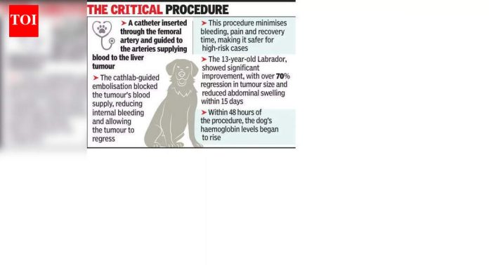 पुणे: शहरातील एका खाजगी पशुवैद्यकीय दवाखान्याने गेल्या महिन्यात 13 वर्षांच्या गंभीर आजारी पुरुष लॅब्राडोरवर – पारंपारिक शस्त्रक्रियेमुळे प्राणघातक रक्तस्त्राव होण्याचा उच्च धोका असताना त्याचे प्राण वाचवण्यासाठी – कॅथलॅब-मार्गदर्शित एम्बोलायझेशन – एक किमान हल्ल्याची प्रक्रिया यशस्वीरित्या पार पाडली.पुण्यातील एका जोडप्याचे पाळीव प्राणी, लॅब्राडोर गंभीर अशक्तपणा, गंभीरपणे कमी प्लेटलेट पातळी, श्वसनाचा त्रास आणि यकृत आणि प्लीहामधील मोठ्या कर्करोगाच्या ट्यूमरने ग्रस्त होते.