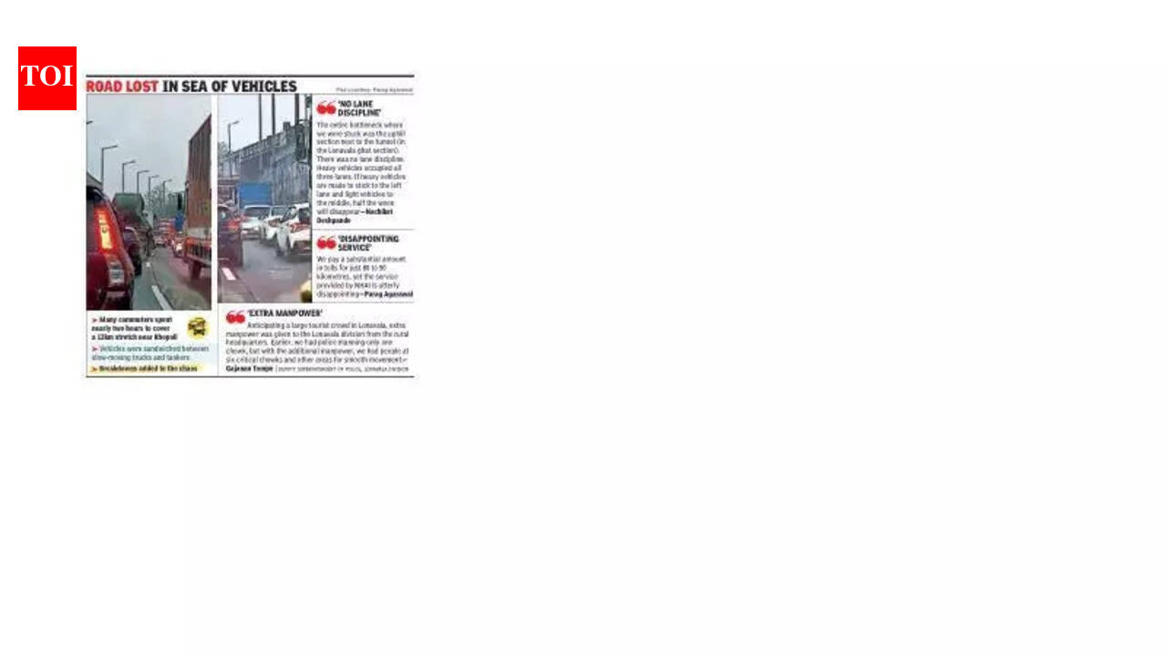 तिन्ही मार्गिका ट्रकने व्यापल्या असल्याचे सांगत प्रवाशांनी सोशल मीडियावर आपला राग व्यक्त केला. खराब लेन शिस्तीने परिस्थिती बिघडली. पुणे-मुंबई प्रवासासाठी पाच तासांपेक्षा जास्त वेळ लागत असताना 320 रुपये टोल भरणे न्याय्य आहे का, असा प्रश्न त्यांनी उपस्थित केला.राजा नरसिंहन यांनी त्यांच्या सकाळच्या प्रवासाचे वर्णन दुःस्वप्न म्हणून केले. “आम्ही पुण्याहून लोणावळा एक्झिटजवळ आलो, तेव्हा वाहतूक ठप्प झाली. 30 मिनिटांच्या अग्नीपरीक्षेत एक गुळगुळीत प्रवास काय झाला असावा. दोषी? शिस्तबद्ध ड्रायव्हिंग आणि या गंभीर बाहेर पडताना वाहतूक व्यवस्थापनाचा स्पष्ट अभाव, तेही या लांबच्या वीकेंडमध्ये. वाळूच्या टँकसह संथ गतीने चालणारी वाहने, अधिकारी-कर्मचारी यांच्यामध्ये वाहने उभी होती. पहाटेच्या गर्दीच्या वेळी ही अराजकता उलगडली, ज्याप्रमाणे रामकृष्ण हॉटेलच्या पुढच्या जंक्शनने आम्हाला आणखी 20 मिनिटे प्रतीक्षा केली.बाहेर पडण्यापूर्वी Google नकाशे तपासलेल्या अनेकांनी लाल रंगात चिन्हांकित केलेले मार्ग पाहिले, ज्यांनी वाहतूक कोंडी दर्शविली आणि त्यांचा प्रवास पुढे ढकलला. केदार जोशीने 5-10 किमीची गर्दी पाहून पालकांना भेटण्यासाठी पुण्याला जाण्याचा त्यांचा बेत सोडला.“माझी मुलं लहान आहेत, आणि लांब ट्रॅफिक जाममध्ये ते चिडले असतील आणि चिडले असतील. सरकारने मुंबई-पुणे-बेंगळुरू सारख्या उच्च रहदारीच्या मार्गांवर RRTS च्या व्यवहार्यतेचा गांभीर्याने अभ्यास केला पाहिजे, ज्याला कार्यक्षम फीडर बस, ट्राम किंवा मेट्रो फीडर सेवांनी समर्थन दिले आहे,” जोशी म्हणाले, लोकसंख्येच्या वाढीसाठी अधिक रेल्वे मार्गांची आवश्यकता होती.ते म्हणाले की केवळ 10-लेन महामार्ग बांधण्यावर लक्ष केंद्रित केल्याने फायदा होणार नाही कारण नवीन गाड्या जोडल्या जातील आणि गहाळ दुवा पूर्ण झाला तरीही एक्सप्रेसवे इतका भार उचलू शकणार नाही. जोशी यांनी TOI ला सांगितले की, “वाहतूक कोंडीसाठी अपेक्षित, नियोजन आणि प्रतिबंधात्मक उपाय सरकारी यंत्रणेमध्ये अनुपस्थित आहेत. ते कायमचे रिॲक्शन मोडमध्ये आहे, ज्यामुळे मनुष्य-तास आणि इंधनाचे प्रचंड नुकसान होते,” जोशी यांनी TOI ला सांगितले.वाहनांच्या बिघाडामुळे गोंधळात भर पडल्याचे प्रवाशांनी सांगितले. राज बोगावत यांनी ट्विट केले की शनिवारी दादर, मुंबई ते पुणे स्थानकापर्यंत प्रवास करण्यासाठी त्यांना सात तास लागले. वाटेत 30 ते 50 हून अधिक वाहने तुटली. बरेच टेम्पो आणि मोठे ट्रक होते,” तो म्हणाला.पराग अग्रवाल आणि कुटुंबीय शनिवारी सकाळी 6 वाजता मुंबईहून महाबळेश्वरला जाण्यासाठी निघाले, परंतु घाट विभागात वाहतूक कोंडीत अडकले. “घाट विभागात नेव्हिगेट करण्यासाठी आम्हाला दोन तास लागले, ज्या