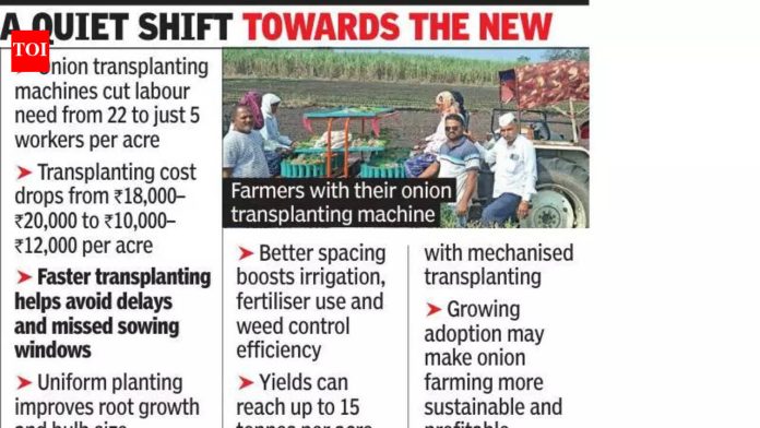 पुणे: कामगारांच्या वाढत्या खर्चाच्या पार्श्वभूमीवर उत्पादकता टिकवून ठेवण्यासाठी महाराष्ट्रातील शेतकरी कांदा लावणी यंत्रांची निवड करत आहेत, ज्यांना कृषी हंगामातही कमी पुरवठा होत आहे.पुणे जिल्ह्यातील जुन्नर तालुक्यात, अशा यंत्रांना झपाट्याने मान्यता मिळाली आहे, शेतकऱ्यांनी वेळ आणि पैशाची लक्षणीय बचत तसेच पीक गुणवत्तेमध्ये सुधारणा केल्याचा अहवाल दिला आहे.कांदा लावणी ही पारंपारिकपणे लागवडीच्या सर्वात श्रम-केंद्रित टप्प्यांपैकी एक आहे. एका एकरावर रोपे लावण्यासाठी शेतकऱ्यांना साधारणत: 20 ते 22 कामगारांची आवश्यकता असते, वाहतूक आणि खाण्याच्या खर्चाव्यतिरिक्त मजुरी म्हणून 18,000 ते 20,000 रुपये खर्च करावे लागतात. कामगारांच्या अनुपलब्धतेमुळे विलंब होतो, ज्यामुळे पेरणीच्या खिडक्या चुकतात आणि उत्पन्नावर परिणाम होतो. कांदा लावणी यंत्रे आल्याने जमिनीवरची परिस्थिती बदलू लागली आहे.शेतकरी यंत्राचा वापर करू शकतात आणि प्रति एकर, फक्त पाच कामगार आणि ट्रॅक्टर चालकासह रु. 10,000 ते रु. 12,000 खर्चून रोपण पूर्ण करू शकतात. लागणारा वेळ झपाट्याने कमी होतो, ज्यामुळे शेतकरी अधिक कार्यक्षमतेने जमीन कव्हर करू शकतात.नारायणगावजवळील हिरडेवाडी गावातील शेतकरी भालचंद्र खोकरले म्हणाले, “पूर्वी कामगारांची व्यवस्था करणे हे सर्वात मोठे आव्हान होते. आमच्याकडे पैसे असतानाही ते वेळेवर उपलब्ध होत नव्हते. मशिनच्या सहाय्याने पुनर्लावणी जलद आणि अधिक एकसमान होते. त्यामुळे ताण आणि खर्च कमी झाला आहे.”शेतकऱ्यांनी सांगितले की, यांत्रिक पद्धतीने लावणीचा सर्वात मोठा फायदा म्हणजे एकसमानता. मशीन समान खोली आणि अंतरावर रोपे लावते, ज्यामुळे मुळांचा चांगला विकास आणि बल्बचा आकार एकसमान होण्यास मदत होते. सुसंगतता सिंचन, खते वापरणे आणि तण काढणे यासारख्या कार्यांना अधिक कार्यक्षम बनवते.“अंतर बदलते आणि मॅन्युअल लागवडीमुळे वाढीवर परिणाम होतो. प्रत्येक रोपाला यंत्राद्वारे समान जागा आणि पोषक तत्वे मिळतात. पीक आरोग्यदायी आणि चांगले उत्पादन हे वास्तव आहे,” जुन्नर तालुक्यातील शेतकरी दीपक उकिर्डे यांनी सांगितले.स्थानिक कृषी तज्ज्ञ आणि अधिकाऱ्यांच्या मते, यांत्रिक प्रत्यारोपणामुळे प्रति एकर इष्टतम रोपांची संख्या सुनिश्चित करून एकूण उत्पादकता वाढू शकते.“एकसमान पंक्ती पाण्याची बचत करण्यास मदत करतात, कारण ठिबक किंवा पूर सिंचन तंतोतंत व्यवस्थापित केले जाऊ शकते. शेतकऱ्यांचा अंदाज आहे की यंत्राचा वापर करून लागवड केलेल्या एकर 15 टन कांद्याचे उत्पादन विविधता आणि व्यवस्थापन पद्धतींवर अवलंबून आहे,” असे राज्य कृषी अधिकाऱ्यांनी सांगितले.हे मशीन शेतकऱ्यांचे हंगामी आणि अविश्वसनीय स्थलांतरित कामगारांव