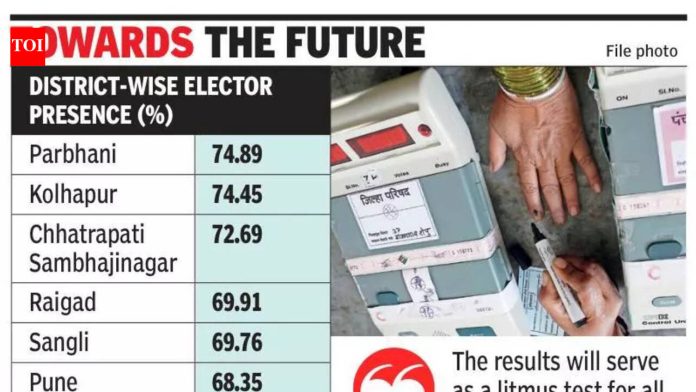 125 तालुक्यांमध्ये सर्वाधिक 74.89% मतदान परभणी जिल्ह्यात झाले, त्याखालोखाल कोल्हापूर (74.45%) आणि छत्रपती संभाजीनगर (72.69%) यांचा क्रमांक लागतो.12 पैकी तीन जिल्ह्यांमध्ये 70% पेक्षा जास्त मतदान झाले. सहा जिल्हे 65%-70% च्या श्रेणीत घसरले, तर तीन 65% च्या खाली राहिले, SEC डेटा दर्शविला. काही तालुक्यांमध्ये, विशेषतः कोल्हापूर जिल्ह्यात, मतदारांचा सहभाग 80% पर्यंत पोहोचला आहे.एसईसीचे प्रमुख दिनेश वाघमारे म्हणाले की, अनेक भागात नियोजित वेळेपेक्षा मतदान वाढले. “संध्याकाळी 5.30 वाजेपूर्वीच नागरिक रांगेत उभे होते आणि त्यामुळे काही अंतर्गत ग्रामीण भागांमध्ये उशिरापर्यंत मतदान सुरू होते. झेडपी निवडणुकीसाठी मतदानाची टक्केवारी सामान्यतः जास्त असते, जसे की पूर्वीच्या स्थानिक स्वराज्य संस्थांच्या निवडणुकांमध्येही कल दिसून आला होता,” त्यांनी TOI ला सांगितले.इतर अलीकडील स्थानिक स्वराज्य संस्थांच्या निवडणुकांच्या तुलनेत मतदानाची अनुकूलता आहे. नगरपरिषद निवडणुकांमध्ये सुमारे 68% मतदान झाले, तर 29 महानगरपालिकांच्या निवडणुकांमध्ये सरासरी केवळ 55% मतदान झाले, जे ग्रामीण स्थानिक प्रशासनामध्ये मतदारांची मजबूत सहभाग दर्शवते, असे एका सर्वेक्षण तज्ञाने सांगितले.पुरुष मतदारांनी 69.6% वर किंचित जास्त सहभाग नोंदवला, तर महिलांच्या 66.8% च्या तुलनेत. तथापि, महिला मतदार नोंदणी – 1.01 कोटी – पुरूष नोंदणी 1.06 कोटीच्या जवळपास होती – सुधारित लिंग समानता दर्शवते. मतदान करणाऱ्यांमध्ये ७४.०६ लाख पुरुष आणि ६७.८४ लाख महिला होत्या.राजकीय संकेतांसाठी, विशेषत: पश्चिम महाराष्ट्रातील काही भागांमध्ये आघाडीत असलेल्या राष्ट्रवादी काँग्रेस पक्षाच्या भविष्यातील दिशा आणि ऐक्याकडे या निवडणुकांचे लक्ष लागले होते. मुळात 5 फेब्रुवारीला होणाऱ्या निवडणुका अजित पवार यांच्या निधनामुळे आणि तीन दिवसांचा राजकीय दुखवटा जाहीर केल्यानंतर 7 फेब्रुवारीपर्यंत पुढे ढकलण्यात आल्या होत्या.रायगड, रत्नागिरी, सिंधुदुर्ग, पुणे, सातारा, सांगली, सोलापूर, कोल्हापूर, छत्रपती संभाजीनगर, परभणी, धाराशिव आणि लातूर जिल्ह्यात मतदान झाले.हे निकाल सर्व प्रमुख पक्षांसाठी लिटमस टेस्ट ठरतील, असे राजकीय तज्ज्ञांनी सांगितले. “भाजप, शिवसेना गट, राष्ट्रवादी गट आणि काँग्रेससाठी निकाल महत्त्वपूर्ण असेल, कारण ZP आणि PS चे नियंत्रण ग्रामीण विकास कार्यक्रम आणि कल्याणकारी योजनांची अंमलबजावणी निर्धारित करते,” असे एका तज्ञाने सांगितले.9 फेब्रुवारी रोजी तालुकास्तरीय केंद्रांवर सकाळी 10 वाजल्यापासून मतमोजणी होणार असून त्यानंतर आदर्श आचारसंहिता उठवली जाईल, असे निवडणूक अधिकाऱ्यांनी सांगितले.