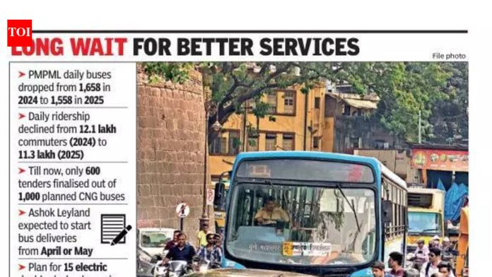 पुणे: राज्याच्या आर्थिक पाहणी अहवालात 2024 च्या तुलनेत 2025 मध्ये दररोज पीएमपीएमएल बसेसची संख्या आणि दैनंदिन प्रवासी संख्येत घट झाल्याचे परिवहन युटिलिटीचे भीषण वास्तव समोर आले आहे. 2025 मध्ये 1,558 बसेस आणि 11.3 लाख प्रवासी प्रतिदिन 2024 च्या तुलनेत 2024 मध्ये 12.1 लाख प्रवासी रहदारीसह दररोज सरासरी 1,658 बसेस रस्त्यावर होत्या.परिवहन मंडळाच्या अधिकाऱ्यांनी सांगितले की, नवीन बसेस सुरू करायच्या होत्या, मात्र ही संपूर्ण प्रक्रिया संथगतीने सुरू होती. एका अधिकाऱ्याने TOI ला सांगितले: “फक्त 1,000 सीएनजी वाहनांपैकी फक्त 600 बसेसच्या निविदा अंतिम करण्यात आल्या आहेत. अशोक लेलँड एप्रिल किंवा मे पासून वितरण सुरू करेल. उर्वरित निविदा प्रलंबित आहेत.”गेल्या वर्षी, परिवहन मंडळाने जाहीर केले होते की पुणे आणि पिंपरी चिंचवडमध्ये सुमारे 15 इलेक्ट्रिक डबल-डेकर बसेस निवडक मार्गांवर चालवल्या जातील, ज्याची चाचणी महिनाभर चालणार आहे. नंतर, अधिका-यांनी सांगितले की विचाराचे पुनर्मूल्यांकन केले जात आहे आणि निविदा प्रक्रिया सुरू करून बस चालवल्या जातील असा निष्कर्ष काढला. सध्या, संपूर्ण योजना मागील बर्नरवर आहे. “आम्ही प्रकल्पाविषयी अधिक तपशील देऊ शकत नाही कारण सीएमडी प्रशिक्षण कार्यक्रमासाठी काही महिन्यांसाठी राज्याबाहेर आहेत. प्रकल्प सध्या होल्डवर आहे,” असे आणखी एका अधिकाऱ्याने सांगितले.याआधी, अनेक वाहतूक तज्ज्ञांनी असे म्हटले होते की, राज्य सरकारने शहरातील वाहतूक समस्या नियंत्रित करण्यासाठी बस सेवांवर गांभीर्याने लक्ष केंद्रित करणे आवश्यक आहे. 2025 च्या टॉमटॉम ट्रॅफिक इंडेक्स अभ्यासामध्ये, पुणे हे जगातील पाचवे सर्वाधिक गर्दीचे शहर म्हणून घोषित करण्यात आले होते – सरासरी गर्दीची पातळी 70% पेक्षा जास्त आहे.“यापूर्वी, PMPML ताफ्यात किमान 4,500 अतिरिक्त बसेसच्या गरजेबद्दल अनेक संवाद झाले आहेत. त्याशिवाय, सध्याची वाहने राखणे आणि सेवा आणि विश्वासार्हता सुधारणे यासह इतर गरजाही आवश्यक आहेत. दुर्दैवाने, काहीही हालचाल झालेली नाही. PMPML कडे सध्या फक्त 2,000 बसेस आहेत, ज्यात अनेक मुख्य मार्गांची व्यवस्था केली जात नाही. संबोधित केले,” शाश्वत गतिशीलता तज्ञ प्रांजली देशपांडे म्हणाल्या.प्रवाशांनी सांगितले की, प्रवासी वाहतूक कमी झाल्याने असे दिसून आले की पीएमपीएमएल सोबत काहीतरी ठोस केले जात नाही तोपर्यंत लोक वाहतुकीच्या इतर साधनांचा शोध घेतील. “स्वारसंख्या वर्षानुवर्षे जवळपास स्तब्ध आहे आणि 11 लाख ते 12 लाखांच्या दरम्यान आहे. घटत्या संख्येवरून असे दिसून येते की लोक पीएमपीएमएल बसमध्ये प्रवास करण्यास इच्छुक नाहीत, जोपर्यंत त्यांना पर्याय नाही. मी माझी दुचाकी किंवा कार सोडून पीएमपीएमएल बस का निवडावी, जेव्हा मला माहित 