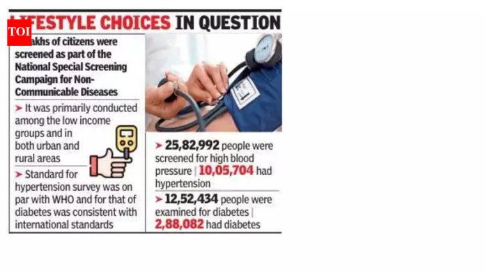 पुणे: राज्याच्या आरोग्य विभागाच्या फेब्रुवारीमध्ये झालेल्या सर्वेक्षणात सुमारे २६ लाख लोकांपैकी १० लाखांना उच्च रक्तदाब असल्याचे निदान झाले आहे. मधुमेहासाठी, विभागाने 12.5 लाख लोकांची तपासणी केली. यापैकी जवळपास २.९ लाख लोकांना मधुमेह असल्याचे आढळून आले.उच्च रक्तदाब आणि मधुमेहाच्या वाढत्या प्रमाणाच्या पार्श्वभूमीवर, असंसर्गजन्य रोगांसाठी राष्ट्रीय विशेष तपासणी मोहिमेचा भाग म्हणून लाखो नागरिकांची तपासणी करण्यात आली. हे प्रामुख्याने कमी उत्पन्न गटांमध्ये आणि शहरी आणि ग्रामीण भागात आयोजित केले गेले.आरोग्य विभागाने एवढ्या कमी कालावधीत लाखो लोकांची तपासणी करण्याची जन मोहीम राबविलेली ही राज्यातील पहिलीच घटना आहे. संख्या समाजातील असंसर्गजन्य रोगांचे उच्च प्रमाण दर्शवते.राज्याचे आरोग्य मंत्री प्रकाश आबिटकर म्हणाले, “या विशेष मोहिमेमुळे नागरिकांमध्ये असंसर्गजन्य आजारांबाबत जागरूकता वाढत आहे. शिवाय, लवकरात लवकर निदान झाल्यास गंभीर गुंतागुंत टाळण्यास मदत होईल. भविष्यातही अधिकाधिक नागरिकांची तपासणी करण्यासाठी अशा मोहिमा राबवण्यावर भर दिला जाईल.”ही मोहीम 1 ते 28 फेब्रुवारी या कालावधीत चालली. 25,82,992 लोकांची उच्च रक्तदाबाची तपासणी करण्यात आली, त्यापैकी 10,05,704 लोकांना उच्च रक्तदाब आणि 12,52,434 लोकांची मधुमेहाची तपासणी करण्यात आली, त्यापैकी 2,88,082 लोकांना मधुमेह आहे. सर्वेक्षणानुसार, दर पाचपैकी दोघांना उच्च रक्तदाब होता. याव्यतिरिक्त, प्रत्येक चार लोकांपैकी एकामध्ये मधुमेह आढळून आला. निदानानंतर या लोकांवर उपचार सुरू झाले आहेत.आरोग्य विभागातील अधिकाऱ्यांनी सांगितले की, यापैकी बऱ्याच प्रकरणांमध्ये रुग्णांना त्यांच्या प्रकृतीबद्दल माहिती नसते.नॅशनल हेल्थ मिशननुसार, उच्च रक्तदाब निदानासाठी मानक थ्रेशोल्ड WHO, भारत, 140 mmHg-सिस्टोलिक किंवा 90 mmHg-डायस्टोलिक पेक्षा जास्त किंवा त्याहून अधिक मार्गदर्शक तत्त्वांशी सुसंगत होते.भारतात मधुमेह निदानासाठी आंतरराष्ट्रीय मानकांप्रमाणेच मार्गदर्शक तत्त्वे पाळली जातात, प्रामुख्याने उपवास प्लाझ्मा ग्लुकोज (126 mg/dL पेक्षा जास्त), 2-तास पोस्ट-ग्लुकोज लोड (200 mg/dL पेक्षा जास्त) किंवा HbA1c (6.5% पेक्षा जास्त किंवा समान) वापरणे.डॉ दत्तात्रय बी पाटील, सल्लागार – नोबल हॉस्पिटल्स अँड रिसर्च सेंटरचे अंतर्गत औषध, म्हणाले, “महाराष्ट्रात मधुमेह आणि उच्च रक्तदाब यांसारख्या जीवनशैलीच्या विकारांची वाढ प्रामुख्याने झपाट्याने शहरीकरण, बैठी सवयी आणि आहारातील खराब निवडीमुळे झाली आहे. डेस्क-बद्ध काम, उच्च-कॅलरी प्रक्रिया केलेले साखर आणि लठ्ठपणा यांसारख्या वायूचे प्रमाण वाढले आहे. प्रदूषण आणि अल्कोहोल, तंबाखू, धूम्रपान इत्यादीसारख्या पदार्था