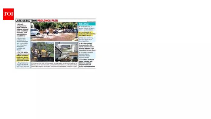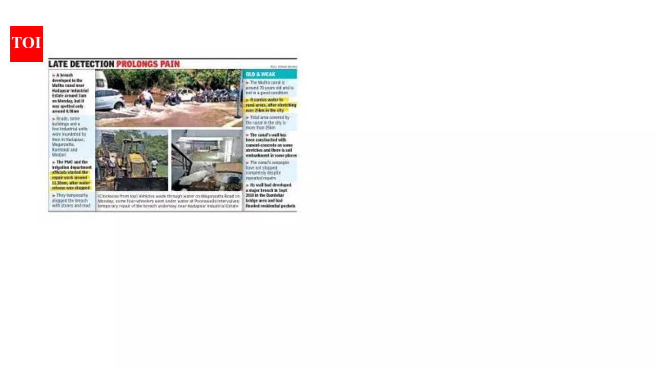 पुणे: शहराच्या पूर्वेकडील भागात सोमवारी पहाटे ते दुपारी 2 वाजेपर्यंत – मुठा उजव्या काठाच्या कालव्याला पहाटे 3 च्या सुमारास भगदाड पडल्याने रस्ते जलमय झाल्याने मोठ्या प्रमाणात वाहतूक कोंडी झाली. परिस्थिती नियंत्रणात आणण्यासाठी शहर वाहतूक पोलिसांना 100 हून अधिक कर्मचारी तैनात करावे लागले.मगरपट्टा, अमनोरा, मुंढवा, हडपसर, सोलापूर रोड आणि खराडी पूल या भागातील पूर्व कॉरिडॉरमधील रस्ते पाण्याखाली गेल्याने वाहनांची वाहतूक विस्कळीत झाली.अतिरिक्त पोलिस आयुक्त मनोज पाटील यांनी TOI यांना सांगितले: “सकाळी 8.30 च्या सुमारास हा भंग झाल्याचे लक्षात आले. आमच्या कर्मचाऱ्यांनी वाहतूक पर्यायी मार्गाने वळवली आणि ॲडव्हायझरी जारी केली. वाहने हडपसरहून मुंढव्याकडे पाठवण्यात आली आणि वाहनधारकांना मुंढव्याहून मगरपट्टा भागाकडे वळवण्यात आले.” वाहतूक पोलिसांनीही कडक बंदोबस्त तैनात केला आणि नागरिकांना एकतर सुरक्षित ठिकाणी थांबण्याचा किंवा घरी जाण्याचा सल्ला दिला.कालव्याजवळ असलेल्या वादळी पाण्याचा निचरा व्यवस्थेमुळे परिस्थिती आणखी बिकट झाली. मगरपट्टा भागाकडे जाणारी ड्रेनेज सिस्टीमची पाइपलाइन आहे. कालव्याचे पाणी त्यात शिरल्याने हडपसर-खराडी मार्गावरील स्ट्रॉमवॉटर ड्रेनची झाकणे पाण्याच्या जोरदार दाबाने उडून गेली आणि रस्त्यांवर पाणी साचले.अनेक वाहने अंशत: पाण्यात बुडाली, तर अनेक वाहने तुटून पडली, कारण प्रवाशांनी त्यांच्या कामाच्या ठिकाणी जाण्यासाठी पाणी साचलेल्या रस्त्यावरून मार्गक्रमण करण्याचा प्रयत्न केला.मगरपट्टा येथे काम करणारे स्वागत कासारे यांनी सांगितले की, कामावर जाताना त्यांना गोंधळाचा सामना करावा लागला. “रस्ता गुडघाभर पाण्याने भरला होता. मी पुढे जाण्याचा प्रयत्न केला, पण माझ्या बाईकच्या एक्झॉस्टमध्ये पाणी शिरले आणि ती तुटली,” तो म्हणाला.अचूक अभियांत्रिकीचे व्यवस्थापकीय संचालक विक्रम साळुंके म्हणाले, “पहाटे ३ च्या सुमारास आमच्या कंपनीच्या आवारात पाणी शिरले. आम्ही वारंवार आपत्ती व्यवस्थापन आणि जिल्हाधिकारी कार्यालयाच्या अधिकाऱ्यांशी संपर्क साधण्याचा प्रयत्न केला, परंतु प्रतिसाद मिळाला नाही. त्यानंतर आम्ही अग्निशमन दलाला फोन केला. त्यांच्या पथकाने घटनास्थळी भेट देऊन सकाळी ७ च्या सुमारास पाटबंधारे विभागाला माहिती दिली.” पाण्यामुळे मशिनरी व इतर साहित्याचे नुकसान झाल्याचे त्यांनी सांगितले.पूनावाला इंटरव्हल्सचे एचआर प्रमुख युवराज पायगुडे म्हणाले, “आमच्या कंपनीच्या आवारात पाणी शिरले, त्यामुळे फर्निचर आणि सुरक्षा केबिनचे मोठ्या प्रमाणात नुकसान झाले. पार्किंग एरिया जलमय झाला होता. तीन चारचाकी गाड्या आणि 12 मोटारसायकली पाण्याखाली गेल्