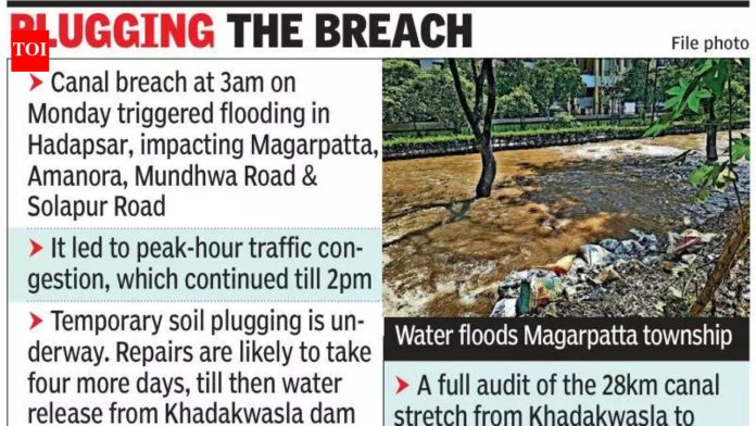 पुणे: सोमवारी पहाटे मुठा उजव्या काठाच्या कालव्याला झालेल्या भगदाडामुळे खडकवासला ते फुरसुंगी या शहरातून वाहणाऱ्या संपूर्ण 28 किलोमीटर लांबीच्या कालव्याचे एप्रिलनंतर मूल्यांकन करण्याचा निर्णय राज्य पाटबंधारे विभागाने घेतला आहे.सोमवारी पहाटे 3 च्या सुमारास झालेल्या या भगदाडामुळे मगरपट्टा टाउनशिप, अमनोरा मुख्य रस्ता, मगरपट्टा-मुंढवा रस्ता आणि सोलापूर रोडसह हडपसरमधील निवासी आणि औद्योगिक भागात पूर आला होता. त्यावेळी पाण्याचा विसर्ग सुमारे 1,100 क्युसेक होता, त्यामुळे अचानक ओव्हरफ्लो झाला. त्यामुळे दुपारी दोनच्या सुमारास परिस्थिती नियंत्रणात येईपर्यंत गर्दीच्या वेळेत मोठ्या प्रमाणात वाहतूक कोंडी झाली.पाटबंधारे विभाग तात्पुरते बंधारा बांधून बुजवत आहे. दुरुस्तीसाठी आणखी चार दिवस लागतील, असे अधिकाऱ्यांनी सांगितले. खडकवासला धरणातून कालव्यात पाणी सोडणे बंद करण्यात आले असून दुरुस्ती पूर्ण झाल्यानंतरच ते पुन्हा सुरू होईल.एका अधिकाऱ्याने सांगितले की, “आम्ही संपूर्ण कालव्याची पाहणी करण्याचा निर्णय घेतला आहे. तथापि, तत्काळ तसे करणे शक्य नाही, कारण उन्हाळी पिकांसाठी पाणीपुरवठा राखणे हे आमचे प्राधान्य आहे. एप्रिलच्या शेवटच्या आठवड्यात सोडण्यात येणारे शेवटचे भाग संपेल, त्यानंतर खडकवासला ते फुरसुंगीपर्यंत सर्वसमावेशक तपासणी केली जाईल. विभाग त्याच्या भविष्यातील कृतीची आखणी करेल.”कालव्याच्या काठी राहणाऱ्या लोकांनी सांगितले की, कालव्याची प्रकृती खालावली आहे.2018 मध्ये मुठा कालव्याला मोठा भगदाड पडलेल्या जनता वसाहत भागातील स्थानिक नगरसेविका प्रिया गडदे यांनी सांगितले की, पूर्वीच्या घटनेनंतर दिलेली बहुतेक आश्वासने पूर्ण झाली नाहीत. “कालवा असुरक्षित आहे. योग्य दक्षता किंवा देखरेख नाही,” ती म्हणाली.खिशातून वाहणाऱ्या सर्व कालव्यांची मोठी दुरुस्ती आवश्यक असल्याचे हडपसर परिसरातील नगरसेवकांनी सांगितले. “नहरांच्या भिंती बहुतांशी गळत आहेत. कालव्याच्या बाजूने भरपूर संरचना आल्या आहेत ज्यामुळे एकूण प्रवाह आणि सुरक्षितता बाधित झाली आहे. देखभालीअभावी स्थानिक रहिवाशांना विविध समस्यांना सामोरे जावे लागते,” असे आणखी एक स्थानिक नगरसेवक अजित घुले यांनी सांगितले.सोमवारच्या घटनेनंतर काही तासांतच महापौर मंजुषा नागपुरे यांनी नागरी प्रशासनाला पाटबंधारे विभागासोबत काम करण्याचे निर्देश दिले होते आणि भविष्यात कालव्याच्या कडेला असलेल्या सर्व संवेदनशील ठिकाणी उपाययोजना सुरू केल्या होत्या.दरम्यान, पाटबंधारे विभाग विविध शक्यता पडताळून पाहत आहे, ज्यामुळे हा भंग झाला असावा. अधिकाऱ्यांनी सांगितले की, भंगाच्या ठिकाणी पाईपलाईन टाकण्यात आल्या आहेत आणि का
