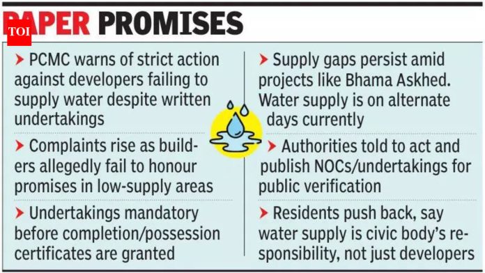 पुणे : लेखी हमीपत्र देऊनही गृहनिर्माण संस्थांना पाणीपुरवठा न करणाऱ्या विकासकांवर कडक कारवाई करण्याचा इशारा पिंपरी चिंचवड महापालिकेने दिला आहे.अधिका-यांनी सांगितले की अनेक भागात अपुऱ्या नगरपालिका पुरवठ्याचा सामना करावा लागतो, बांधकाम व्यावसायिकांनी आश्वासन दिले होते की नागरी पायाभूत सुविधा पूर्णतः कार्यान्वित होईपर्यंत ते रहिवाशांसाठी पाण्याची व्यवस्था करतील. तथापि, अनेक विकासकांनी त्यांच्या वचनबद्धतेचा आदर केला नसल्याच्या तक्रारी समोर आल्या आहेत.मुंबई उच्च न्यायालयात सुरू असलेल्या जनहित याचिकेसंदर्भात विभागीय आयुक्त कार्यालयात शुक्रवारी झालेल्या बैठकीत या विषयावर चर्चा करण्यात आली. बैठकीला PCMC, पुणे महानगरपालिका (PMC) आणि PMRDA चे अधिकारी उपस्थित होते.PCMC अधिकाऱ्यांनी बैठकीदरम्यान सांगितले की भामा आसखेड योजनेसारख्या चालू असलेल्या प्रकल्पांमुळे ते काही भागात वचन दिलेला 100% पुरवू शकले नाहीत – सध्याच्या पाणीपुरवठ्यात 167 MLD जोडणे अपेक्षित आहे. सध्या, नागरी संस्था पवना धरण (530 MLD) आणि आंद्रा धरण (100 MLD) मधून MIDC 30 MLD पुरवून पर्यायी दिवशी पाणी पुरवठा करते.अधिकाऱ्यांनी सांगितले की, नागरी संस्था पूर्णता किंवा ताबा प्रमाणपत्र देण्यापूर्वी जोपर्यंत महापालिका यंत्रणा कार्यान्वित होत नाही तोपर्यंत विकासकांना त्यांच्या स्वखर्चाने पाणीपुरवठ्याची हमी देणारे लेखी उपक्रम देणे बंधनकारक आहे.एका वरिष्ठ PCMC अधिकाऱ्याने सांगितले की, विभागीय आयुक्तांनी अधिकाऱ्यांना निर्देश दिले आहेत की जे विकासक उपक्रमांचे पालन करण्यात अयशस्वी ठरतात किंवा रहिवाशांवर आर्थिक बोजा टाकतात, ज्यांना खाजगी पाण्याच्या टँकरवर अवलंबून राहावे लागते. याव्यतिरिक्त, नागरी संस्थेला सर्व संबंधित ना-हरकत प्रमाणपत्रे आणि उपक्रम त्यांच्या अधिकृत वेबसाइटवर प्रकाशित करण्याचे निर्देश देण्यात आले आहेत जेणेकरून रहिवाशांना अशा वचनबद्धतेची पडताळणी करता येईल.PCMC आयुक्त विजय सुर्यवंशी म्हणाले, “असे विकासक कायदेशीररित्या त्यांच्या वचनबद्धतेची पूर्तता करण्यास बांधील आहेत. या संदर्भात कोणतेही अपयश किंवा नकार हे उल्लंघन मानले जाईल आणि आम्ही रहिवाशांच्या तक्रारींवर कठोर कायदेशीर कारवाई करू. भामा आसखेड योजना पूर्णत: कार्यान्वित होईपर्यंत विकासकांची जबाबदारी कायम राहील.”तथापि, बहुतेक रहिवाशांनी नागरी संस्थेच्या हस्तक्षेपाचे स्वागत केले आहे, तर अनेकांनी बांधकाम व्यावसायिकांवर जबाबदारी टाकल्याची टीका केली आहे.पिंपरी चिंचवड गृहनिर्माण संस्था फेडरेशनचे अध्यक्ष दत्तात्रय देशमुख म्हणाले की, पाणीपुरवठा करणे ही महापालिकेची जबाबदारी आहे. “नागरी संस्था पाणी कर वसूल करते, त्यामुळे त्यांनी पुरव