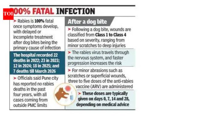 पुणे: नागरी संस्थेच्या डॉ. नायडू संसर्गजन्य रोग रुग्णालयात 2022 ते मार्च 2025 दरम्यान 82 रेबीज रुग्णांना दाखल करण्यात आले आहे. लक्षणे आधीच दिसू लागल्यानंतर सर्व रुग्णांना परिघीय आणि ग्रामीण भागातून आणण्यात आले होते.पुण्याचे जिल्हा आरोग्य अधिकारी डॉ रामचंद्र हंकारे म्हणाले की, रेबीज झालेले बहुतेक रुग्ण एकतर त्यांच्या जखमांवर योग्य उपचार करू शकत नाहीत किंवा अपूर्ण उपचार घेतात.रेबीज हा 100% जीवघेणा विषाणूजन्य आजार आहे जेव्हा क्लिनिकल लक्षणे दिसू लागतात आणि भारतात दरवर्षी सुमारे 20,000 मृत्यूंना कारणीभूत असतात.नायडू रुग्णालयाच्या आकडेवारीनुसार, 2022 मध्ये रेबीजमुळे 22 मृत्यू झाले; 2023 मध्ये 23; 2024 मध्ये 12; 2025 मध्ये 18; आणि मार्च 2026 अखेरपर्यंत 7 मृत्यूची नोंद झाली आहे.“महापालिकेच्या आकडेवारीनुसार, सर्व नागरी रुग्णालयात सुमारे 60,000 डोस अँटी-रेबीज लसींची आवश्यकता आहे. या लसी महानगरपालिकेने जारी केलेल्या स्थानिक निविदांद्वारे खरेदी केल्या जातात. सर्व महापालिका रुग्णालयांमध्ये अँटी-रेबीज इंजेक्शन्स मोफत दिली जातात. खाजगी दवाखान्यांमध्ये, लसीच्या डोसची किंमत 400 ते 300 रुपयांपासून सुरू होते. 4,000 खोल किंवा रक्तस्त्राव झालेल्या जखमांच्या बाबतीत, PMC ने गेल्या चार वर्षात शहराच्या हद्दीत रेबीजशी संबंधित कोणत्याही मानवी मृत्यूची नोंद केलेली नाही, काहीवेळा पुणे महानगरपालिकेचे आरोग्य अधिकारी, सॅन पीएमसी, सहाय्यक डॉ.“नायडू हॉस्पिटल हे राज्याचे प्राथमिक संसर्गजन्य रोगांचे विलगीकरण केंद्र असल्याने, रेबीजची लक्षणे दर्शविणाऱ्या सर्व रुग्णांना येथे संदर्भित केले जाते. ग्रामीण भागात, आमच्याकडे ग्रामीण, उपजिल्हा, प्रसूती आणि जिल्हा रुग्णालयांमध्ये अँटी-रेबीज लस आणि इम्युनोग्लोब्युलिनचा पुरेसा साठा आहे. रुग्णांना लक्षणे दिसू लागल्यानंतर आणि त्यांना अलगावची आवश्यकता झाल्यानंतरच नायडूकडे पाठवले जाते,” हंकारे पुढे म्हणाले.ते पुढे म्हणाले की, कुत्र्याला चावल्यास जखमेला साबणाने आणि पाण्याने ताबडतोब धुवावे आणि रेबीज प्रतिबंधक लस विलंब न लावता द्यावी.“जखमेची तीव्रता आणि स्थान यावर अवलंबून, 24 तासांच्या आत लसीकरण करणे महत्वाचे आहे. आवश्यक असल्यास, दुय्यम देखभाल केंद्रात इम्युनोग्लोब्युलिन प्रशासित केले जाते. वैद्यकीय अधिकाऱ्यांना देखील कमतरता असल्यास स्थानिक पातळीवर लस घेण्याच्या सूचना देण्यात आल्या आहेत,” ते पुढे म्हणाले.