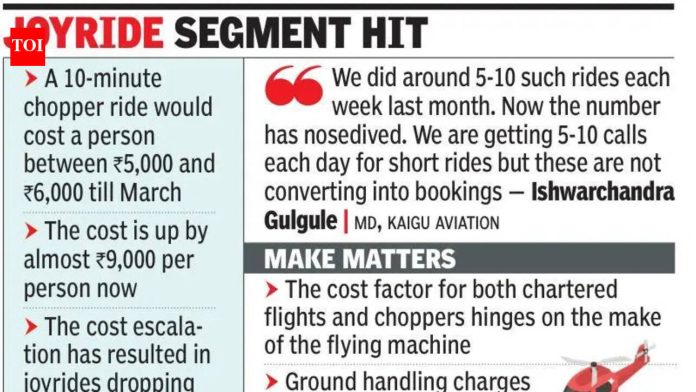 पुणे: मुंबईसाठी मस्त हेलिकॉप्टर राईड किंवा चार्टर्ड फ्लाइटने दिल्लीला जाणे एप्रिलमध्ये 30-40% महाग झाले आहे – टीएस एलियटचा “सर्वात क्रूर महिना”.कारण: पश्चिम आशिया संघर्ष-प्रेरित एव्हिएशन टर्बाइन इंधन (ATF) ची किंमत वाढ. अंतिम परिणाम: ऑपरेटर्सच्या ग्राहक बेसमध्ये घट.Kaigu Aviation चे व्यवस्थापकीय संचालक ईश्वरचंद्र गुलगुले यांनी TOI ला सांगितले, “याआधी, मुंबईला हेलिकॉप्टर भाड्याने घेण्यासाठी सुमारे 3.5 लाख ते 4 लाख रुपये खर्च करावे लागायचे. एप्रिलमध्ये 18% GST वगळून भाडे जवळपास 5.5 लाख रुपये झाले आहे.”एप्रिलमध्ये एटीएफच्या किमतीने भारतात विक्रमी उच्चांक गाठला. नॉन-शेड्युल्ड आणि चार्टर्ड ऑपरेशन्ससाठी त्याची किंमत या महिन्यात दुपटीहून अधिक वाढून 1,94,968.67 रुपये प्रति किलोलीटर झाली आहे, जी मुंबईतील रुपये 90,451.87 प्रति किलोलीटर आहे.अमेरिकन-इंग्रजी कवी, नाटककार आणि साहित्यिक समीक्षक एलियट यांनी एप्रिलला “द वेस्ट लँड” मध्ये “सर्वात क्रूर महिना” म्हटले कारण वसंत ऋतुने जीवन पुन्हा परत येण्यास भाग पाडले. ATF किमतीतील वाढीव सुधारणा आणि त्यानंतरच्या विमान भाड्यात वाढ झाल्यामुळे फ्लायर्स या महिन्याला “असभ्य” म्हणू शकतात.गुलगुले म्हणाले, “नवी मुंबई आंतरराष्ट्रीय विमानतळाच्या उद्घाटनामुळे दोन्ही शहरांमधील हेलिकॉप्टरवरील हवाई प्रवासाचा वेळ आधीच्या ४५ मिनिटांवरून एक तासापर्यंत वाढला. प्रथम, यामुळे भाडे वाढले. पश्चिम आशियातील संघर्षामुळे वाढलेल्या एटीएफच्या किमतीमुळे ते आणखी वाढले.”पुणे आणि मुंबई दरम्यान सरासरी साप्ताहिक हेलिकॉप्टरची हालचाल 25-30 च्या आसपास आहे. प्रामुख्याने राजकारणी, व्यापारी आणि उद्योजक हे ग्राहक आहेत.पुणे-सोलापूर, पुणे-कोल्हापूर आणि पुणे-संभाजीनगर या मार्गावरील हेलिकॉप्टरच्या दरात सारखीच वाढ करण्यात आली आहे. गुलगुले म्हणाले, “या मार्गांवर भाडे सारखेच आहे आणि त्यामुळे भाडेवाढही आहे.”“आमचे बरेचसे नियमित ग्राहक अजूनही हेलिकॉप्टर वापरत आहेत, पण हळूहळू घट दिसून येत आहे. चिंताजनक बाब म्हणजे नवीन ग्राहक आता येत नाहीत. आम्हाला दररोज 10-12 क्वेरी येत आहेत, पण त्या बुकिंगमध्ये बदलत नाहीत. या क्षणी, व्यवसाय कोणत्या दिशेने चालला आहे हे आम्हाला माहीत नाही,” गुलगुले म्हणाले.अन्य विमान वाहतूक कंपनीच्या प्रतिनिधीने सांगितले की चार्टर फ्लाइटच्या खर्चातही झपाट्याने वाढ झाली आहे. “उदाहरणार्थ, पुणे ते दिल्ली (वन-वे) ट्रिपची किंमत पूर्वी सुमारे 10 लाख रुपये होती. आता जीएसटी वगळता जवळपास 14 लाख रुपये आहे. त्याचप्रमाणे, पुणे ते बेंगळुरू या एकेरी सहलीचा खर्च आता रुपये 8 लाख किंवा त्याहून अधिक आहे. पूर्वी, पॉकेट पिंच प्रति ट्रिप रुपये 6 लाख होती. चार्टर्ड फ्लाइट आणि चॉपर ग्राउंड दोन्ह
