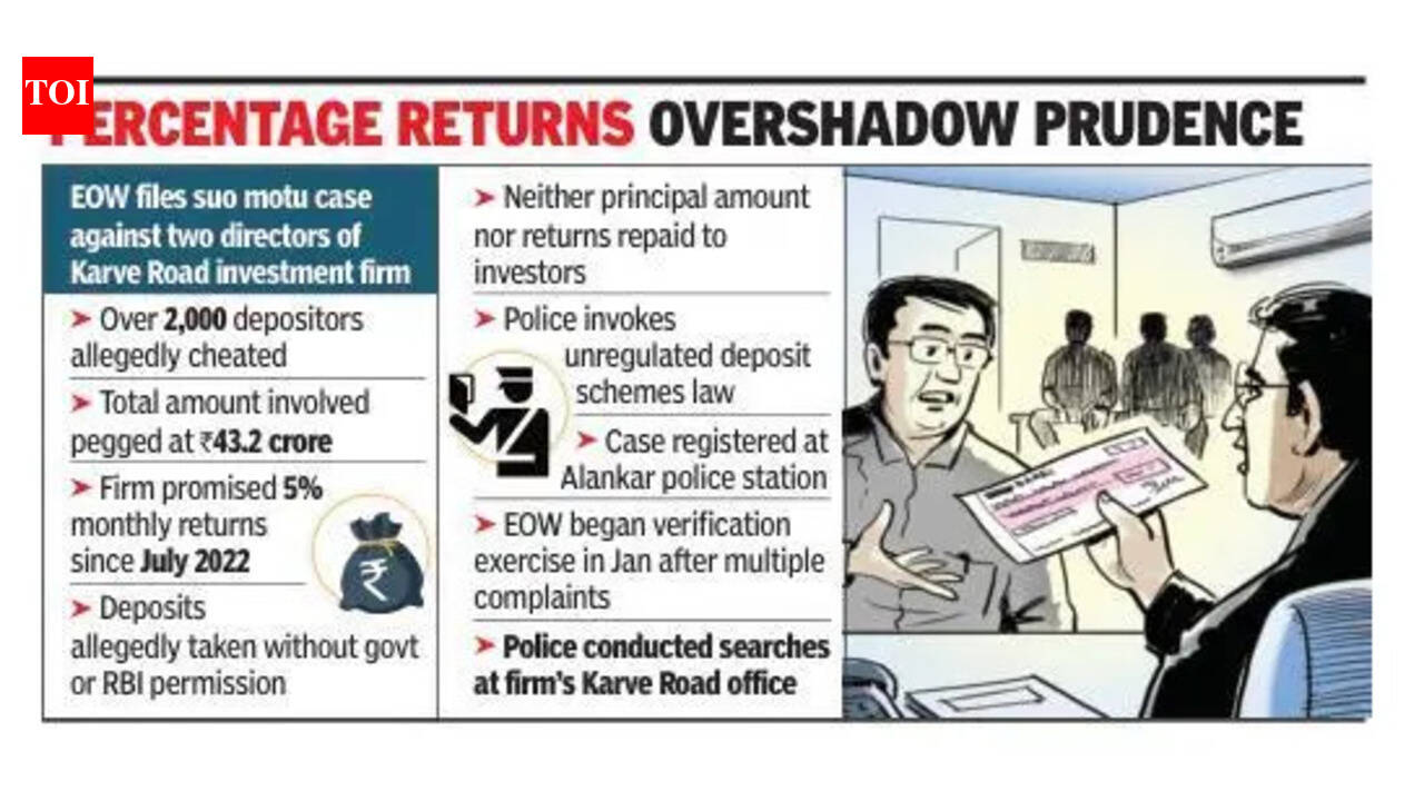 गीतेश.शेळकेपुणे: पुणे शहर पोलिसांच्या आर्थिक गुन्हे शाखेने (EOW) अनरेग्युलेटेड डिपॉझिट स्कीम्स कायद्यावर बंदी घालण्यासाठी स्वत: कारवाई केली असून कर्वे रोडच्या एका गुंतवणूक कंपनीच्या दोन संचालकांविरुद्ध त्यांच्या गुंतवणुकीवर 5% मासिक परतावा देण्याचे आश्वासन देऊन 43.2 कोटी रुपयांची फसवणूक केल्याचा आरोप आहे.काही दिवसांपासून बाधित ठेवीदार आपल्या तक्रारी घेऊन पोलिसांकडे जात आहेत. मात्र, त्यांच्यापैकी कोणीही तक्रार देण्यास तयार नव्हते.पोलिस उपायुक्त (EOW) विवेक मासाळ म्हणाले, “आम्ही या प्रकरणाची पडताळणी करण्यासाठी जानेवारीमध्ये एक कवायत सुरू केली. आम्हाला समजले की दोन संचालकांनी 2,000 व्यक्तींकडून (ठेव खात्यांची संख्या) ठेवी स्वीकारल्या आहेत. या ठेवींची एकूण रक्कम 43.2 कोटी रुपये आहे. या दोघांनी ना ठेवी परत केल्या, ना परत करण्याचे आश्वासन दिले.”“दोन्ही संचालकांनी सरकार किंवा रिझर्व्ह बँक ऑफ इंडियाची परवानगी न घेता ठेवीदारांकडून पैसे स्वीकारले. ही एक अनियंत्रित ठेव योजना होती आणि पोलिसांना अशा योजनांविरुद्ध कारवाई करण्याचे अधिकार आहेत,” तो म्हणाला.याप्रकरणी अलंकार पोलीस ठाण्यात गुन्हा दाखल करण्यात आला आहे.रविवारी दुपारी, TOI ने फर्मच्या कर्वे रोड ऑफिसला भेट दिली, जे लोक आणि कर्मचाऱ्यांनी खचाखच भरले होते. एका गुंतवणूकदाराने TOI ला सांगितले: “मी माझ्या गुंतवणुकीचे तपशील तपासण्यासाठी आलो होतो आणि फर्मच्या अधिकाऱ्यांनी मला सांगितले आहे की माझ्या गुंतवणुकीला काहीही होणार नाही. माझा त्यांच्यावर विश्वास आहे.”एका फर्म अधिकाऱ्याने TOI ला सांगितले: “आमच्या विरुद्धची तक्रार बनावट आहे.”दरम्यान, मासाळ म्हणाले, “फर्मद्वारे मोठ्या संख्येने ठेवीदारांची फसवणूक आणि त्यात असलेली रक्कम लक्षात घेऊन आम्ही स्वत: तक्रार नोंदवण्याचा निर्णय घेतला. बाधित व्यक्तींनी जानेवारी आणि फेब्रुवारीमध्ये त्यांच्या तक्रारी घेऊन आमच्याकडे संपर्क साधला होता. आमच्या पथकांनी कर्वे रोडवरील फर्मच्या कार्यालयात झडती घेतली आहे.”