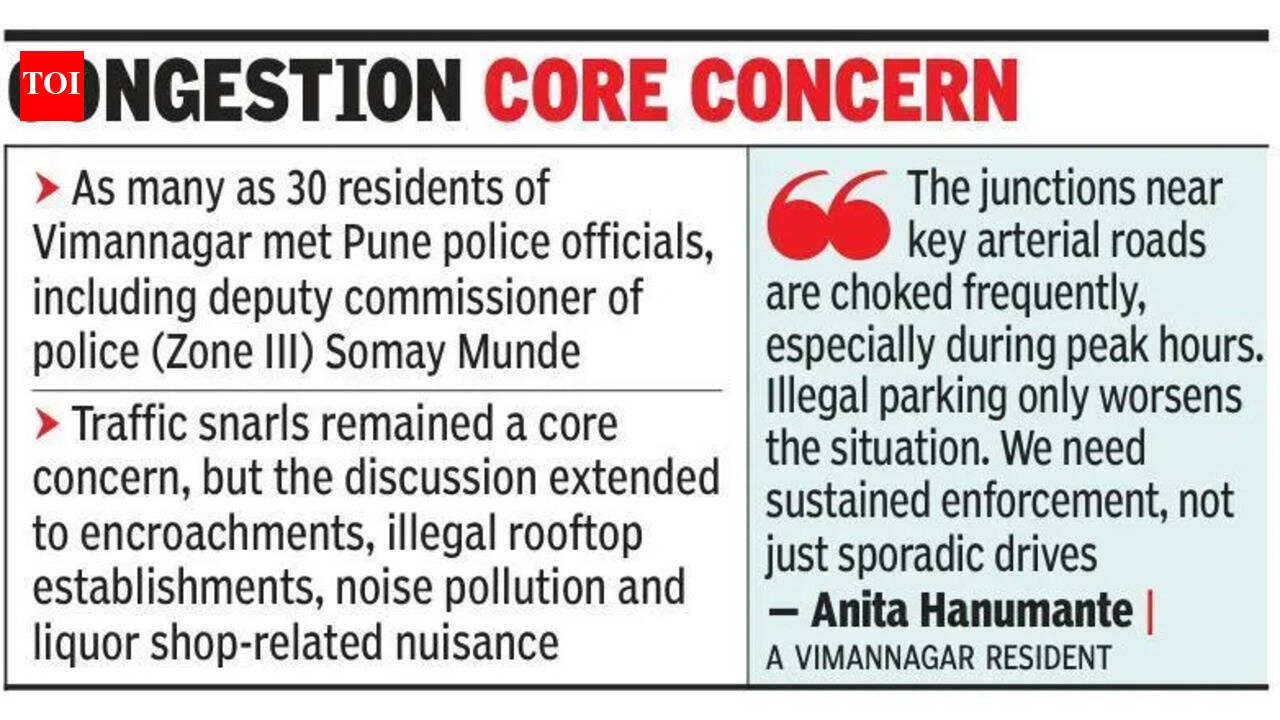पुणे: विमाननगरमधील रहिवाशांनी नुकतीच या भागातील सततची वाहतूक कोंडी आणि नागरी समस्यांकडे लक्ष वेधण्यासाठी पुणे पोलिस अधिकाऱ्यांची भेट घेतली, विभाग प्रमुख अडथळे ओळखून आणि आगामी काळात लक्ष्यित अंमलबजावणीचे आश्वासन देत आहे.पोलिस उपायुक्त (झोन VII) सोमय मुंडे यांच्यासह इतर अधिकाऱ्यांनी 30 रहिवाशांची भेट घेतली.वाहतूक कोंडी हा मुख्य चिंतेचा विषय राहिला, परंतु चर्चा अतिक्रमण, बेकायदेशीर छतावरील आस्थापने, ध्वनी प्रदूषण आणि दारूच्या दुकानाशी संबंधित उपद्रवांपर्यंत विस्तारली. रहिवाशांनी सांगितले की सर्व घटकांमुळे अतिपरिचित भागातील गर्दी आणि सुरक्षिततेच्या धोक्यात योगदान होते.“मुख्य धमनी रस्त्यांजवळील जंक्शन्स वारंवार गुदमरतात, विशेषत: गर्दीच्या वेळी. बेकायदा पार्किंगमुळे परिस्थिती आणखी बिघडते. आम्हाला केवळ तुरळक ड्राईव्हच नव्हे तर सातत्यपूर्ण अंमलबजावणीची गरज आहे,” अनिता हनुमंते, स्थानिक रहिवासी म्हणाल्या.कारवाईला सुरुवात झाल्याचे अधिकाऱ्यांनी सांगितले. विमाननगरमधील एक छतावरील आस्थापना बंद करण्यात आली, तर इतरांवर बारीक नजर ठेवण्यात आली. जलद कायदेशीर कारवाई सक्षम करण्यासाठी रहिवाशांना उल्लंघनाचे फोटो आणि व्हिडिओ पुरावे शेअर करण्यासाठी प्रोत्साहित केले गेले.आणखी एक रहिवासी संदीप सिंग म्हणाले, “परिसरातील वाहतूक व्यवस्थापन फक्त सिग्नलपुरते नाही. अतिक्रमण, रस्त्याच्या कडेला असलेले मद्यपान आणि व्यावसायिक आस्थापनांभोवतीचे अनियंत्रित क्रियाकलाप या सर्व गोष्टी दैनंदिन गोंधळाशी निगडीत आहेत.”पोलिस अधिकाऱ्यांनी ऑपरेशनल आव्हाने देखील अधोरेखित केली आणि सांगितले की अतिक्रमण आणि बेकायदेशीर क्रियाकलापांविरूद्ध मोहिमेसाठी कायदेशीर आणि लॉजिस्टिक प्रक्रियेमुळे सहसा सहा तास लागतात.विश्वास निर्माण करण्याच्या प्रयत्नात, मुंढे यांनी रहिवाशांना अंमलबजावणी मोहिमेदरम्यान स्वयंसेवकांना आमंत्रित केले आणि उल्लंघनाची तक्रार करणाऱ्यांना संरक्षणाची हमी दिली. “सामुदायिक समस्या मांडण्यासाठी धमक्यांचा सामना करणाऱ्या कोणालाही थेट पोलिसांशी संपर्क साधता येईल,” ते पुढे म्हणाले.रहिवाशांनी सांगितले की ते अधिका-यांकडे पाठपुरावा करतील कारण ओळखल्या गेलेल्या अडथळ्यांना दूर करण्यासाठी तपशीलवार योजनांची प्रतीक्षा आहे.