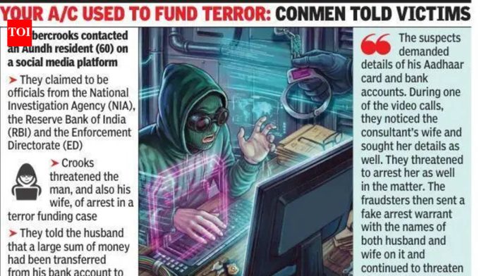 पुणे: एका इलेक्ट्रिकल आणि पाईप मॅन्युफॅक्चरिंग फर्मच्या औंध येथील सल्लागार (60) यांनी शुक्रवारी पुणे सायबर पोलिसांकडे तक्रार दाखल केली, ज्यामध्ये सायबर चोरांनी 13 मार्च ते 22 एप्रिल दरम्यान त्यांना आणि त्यांच्या पत्नीला दहशतवादी फंडिंग प्रकरणात अटक करण्याची धमकी देऊन 1.18 कोटी रुपयांची फसवणूक केली.पुणे सायबर पोलिसांनी शुक्रवारी सायबर चोरांविरुद्ध फसवणुकीचा गुन्हा दाखल केला. तक्रारकर्त्याने असेही म्हटले आहे की बदमाश हे राष्ट्रीय तपास संस्था (NIA), रिझर्व्ह बँक ऑफ इंडिया (RBI) आणि अंमलबजावणी संचालनालय (ED) चे अधिकारी आहेत.पोलिसांनी दिलेल्या माहितीनुसार, फसवणूक करणाऱ्यांनी १३ मार्च रोजी तक्रारदाराशी एका मेसेजिंग ॲप्लिकेशनवर संपर्क साधला आणि ईडीचे अधिकारी असल्याचा दावा केला.त्यांनी त्याला सांगितले की त्याच्या बँक खात्यातून भारतातील बंदी असलेल्या पीएफआयमध्ये मोठ्या प्रमाणात पैसे हस्तांतरित केले गेले आहेत. त्यांनी पुढे दावा केला की हा पैसा दहशतवाद्यांनी देशातील क्रियाकलापांना निधी देण्यासाठी वापरला होता, असे पोलिसांनी जोडले.फसवणूक करणाऱ्यांनी सल्लागाराला कळवले की एनआयए आणि आरबीआय द्वारे देखील या प्रकरणाची चौकशी केली जात आहे आणि दहशतवादी कारवायांसाठी निधीची लाँडरिंग केल्याचा आरोप आहे.पुणे सायबर पोलिसांच्या वरिष्ठ निरीक्षक स्वप्नाली शिंदे यांनी TOI ला सांगितले, “त्यानंतर, संशयितांनी त्याच्या आधार कार्ड आणि बँक खात्यांचे तपशील मागितले. एका व्हिडिओ कॉल दरम्यान, त्यांनी सल्लागाराच्या पत्नीकडे लक्ष वेधले आणि तिचा तपशीलही मागितला. त्यांनी या प्रकरणात तिला अटक करण्याची धमकी दिली.”“फसवणूक करणाऱ्यांनी त्यानंतर पती-पत्नी दोघांची नावे असलेले बनावट अटक वॉरंट पाठवले आणि त्यांना अटकेच्या धमक्या देणे सुरूच ठेवले. अटकेमुळे कुटुंबाचे नाव बदनाम होईल, असा दावा त्यांनी केला,” शिंदे म्हणाले.एफआयआरनुसार, फसवणूक करणाऱ्यांनी नंतर पैशाच्या बदल्यात जोडप्यावरील आरोप निकाली काढण्याचे आश्वासन दिले. त्यानंतर सल्लागाराने फसवणूक करणाऱ्या सात बँक खात्यांमध्ये 1.18 कोटी रुपये ट्रान्सफर केले.